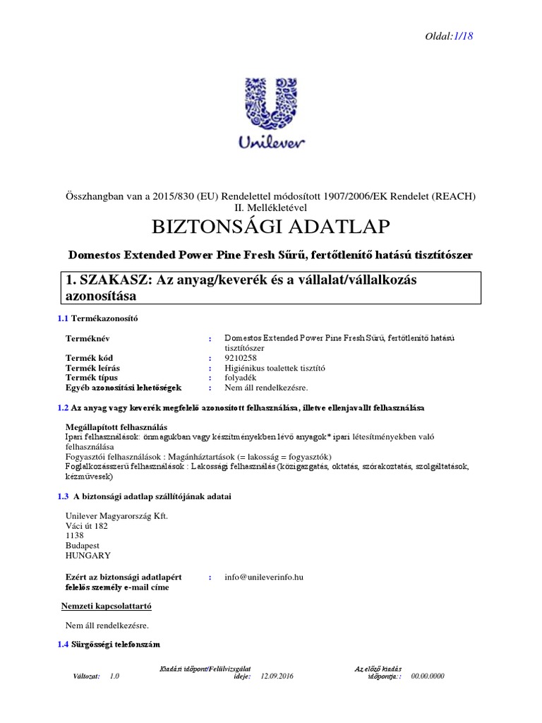 Biztonsagi Adatlap Domestos Feherito Feherito Es Fertotlenito Hatasu Tisztitoszer Pdf Free Download